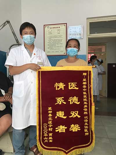 “感谢你们治好了我的眩晕,我还以为自己得了严重的病,为你们精湛的技术点赞”, 贾女士一边激动地表达着自己的感激之情,一边将写着“医德双馨、情系患者”的锦旗送到了望都县中医医院耳鼻喉科医生沈浩的手中。
