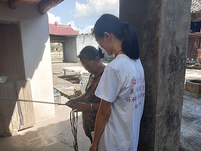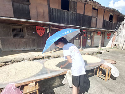 出发前,队员们在专业中医师的指导下制作了龙眼银耳莲子羹、薏仁芡实猪肝汤等药膳,在向爷爷奶奶们简单地介绍了药膳后,请他们品尝这些药膳。长辈们品尝完笑眯眯地表示日后愿意尝试动手制作。通过深一步的交谈,队员们了解到村民们虽然对各类药膳具体功效不甚清楚,但坚信药膳能滋补身体,平时也有结合各类中药材煲汤养生的习惯。队员在走访的途中,还观察到村民露天晒制择子粉的场景。