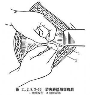 (1)切开腹壁:操作与侧入法相同,但为了充分暴露膀胱及子宫下段,对双侧腹壁后间隙及耻骨后间隙,都需加以分离,但不可过深。向左、右拉开已经游离的腹壁切口后,切开菲薄的腹横筋膜,连同其下的脂肪推向膀胱两侧,使膀胱清楚地显露,有利于操作。有时因此层筋膜很薄,不须切口,仅用手指便可向两侧推开。
