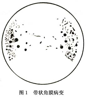 帶狀角膜病變可發生於各種年齡,多爲單眼,亦可雙眼發病。病變緩慢發展,可長達10年以上。初期的角膜混濁極輕微,肉眼不易發現。混濁明顯時可見其位於瞼裂部暴露區角膜,相當於前彈力膜水平,分別在鼻、顳側近周邊處,陸續出現鈣質性灰白色或白色混濁斑,混濁區與角膜緣之間有一條約1mm的狹窄透明帶將其隔開。混濁區的中央側較模糊,可向中央緩慢地擴展。經多年變化後兩端混濁才能相接,融合成3~5mm寬的帶狀病變。有時可伴新生血管生長。裂隙燈檢查可見混濁鈣斑內有透明小孔,是三叉神經穿過前彈力膜的通道。混濁區由上皮下、前彈力膜及基質淺層的沉着物所構成。混濁斑可逐漸緻密、增厚,使其上方的上皮隆起,粗糙不平,甚至發生上皮糜爛,引起畏光、流淚及眼痛等刺激症狀。晚期患者的視力可明顯減退(圖1)。