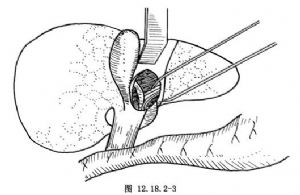 在切除至第二肝门附近时,下腔静脉与肝组织间有许多肝短静脉与尾状叶左段相连,应在手术中小心地逐一结扎切断。肝断面用带蒂大网膜覆盖,然后间断缝合固定。为减少出血,切肝时可用微波刀、超声刀等,肝断面渗血可用温热盐水纱布压迫,有条件时用氩气刀,也可用医用生物蛋白胶、止血纱布等协助止血。肝断面下放置烟卷式引流及乳胶管引流。